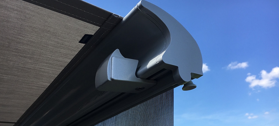 Selon le niveau de confort souhaité, le store est entraîné soit manuellement à l'aide d'une manivelle, soit électriquement par télécommande sans fil (moteur Somfy).
